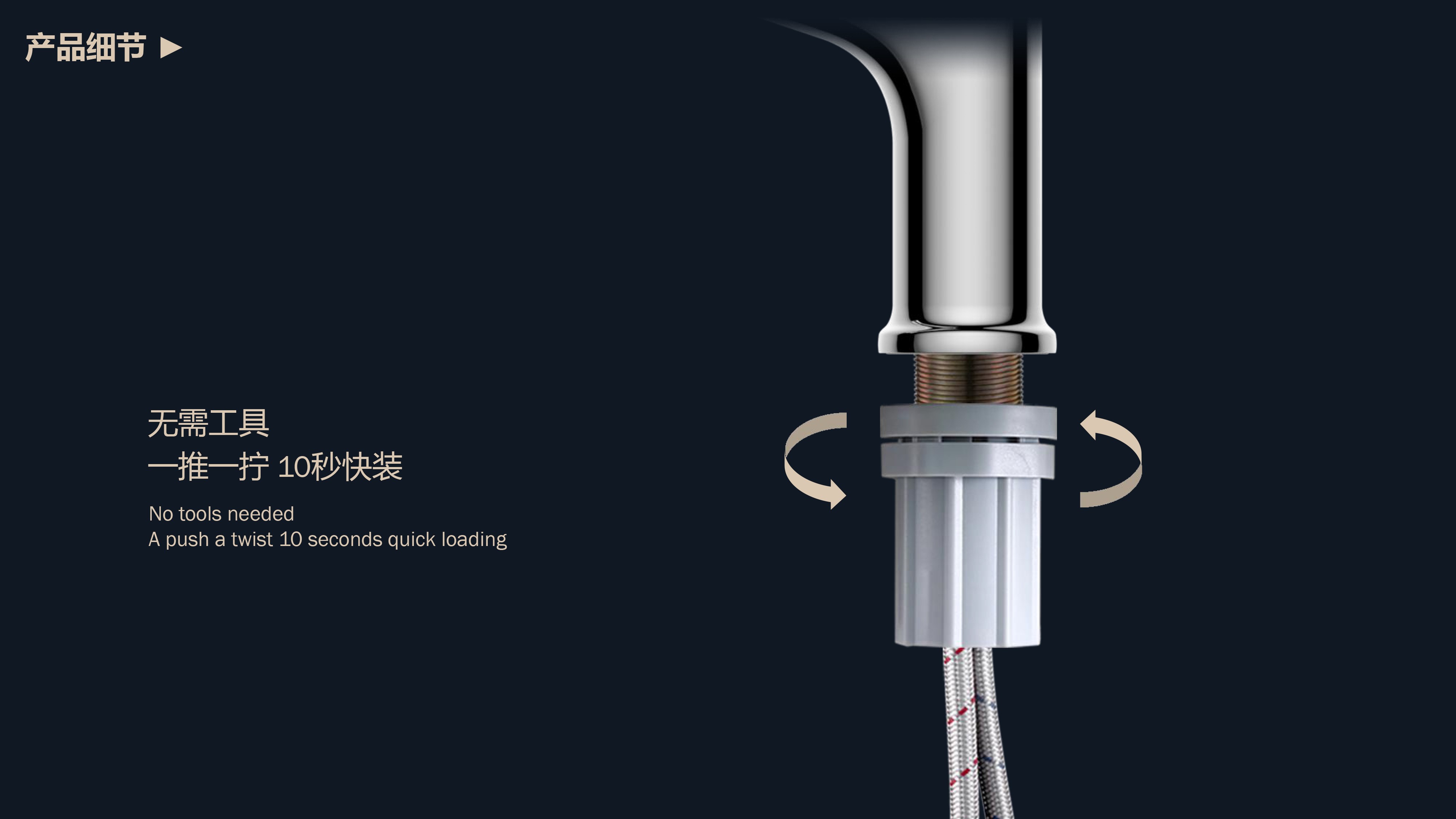360°全方位抽拉清洗;微光龍頭,深夜使用不開大燈,不刺眼;日常洗頭利器,抽拉出水輕松洗;按壓切換兩功能水花;三種顏色LED燈光顯示水溫;重力錘復(fù)位設(shè)計,順暢伸縮,精準回位;無需工具,一推一擰10秒快裝
