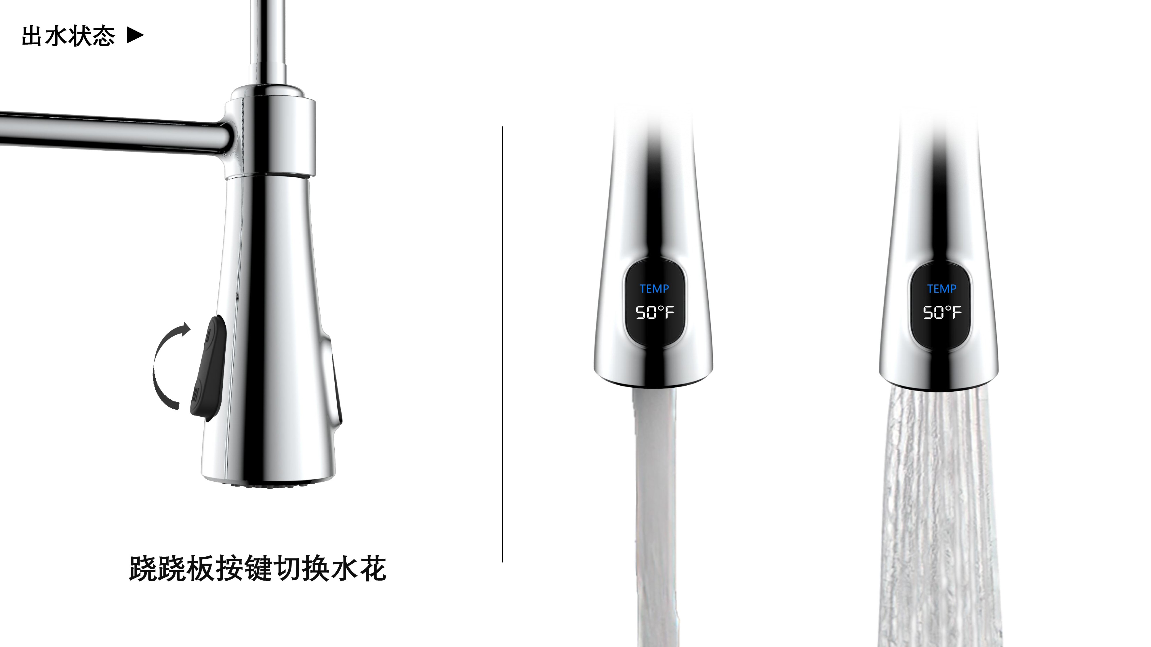 雙控廚房龍頭 ;感應(yīng)免接觸啟閉,有效感應(yīng)距離20cm;智能芯片恒溫技術(shù)雙控盒;智能芯片溫度數(shù)顯抽拉頭-冷水TEMP顯示藍(lán)色、溫水TEMP顯示綠色、熱水TEMP顯示紅色;兩種出水抽拉頭可多角度使用
